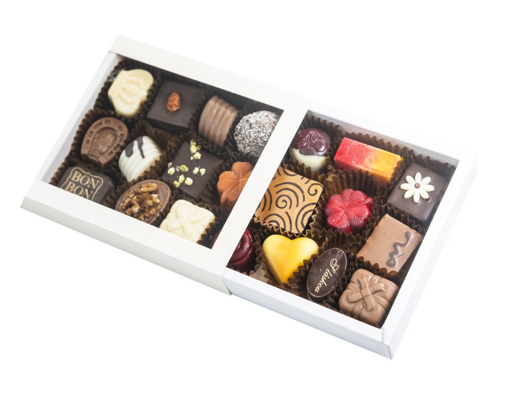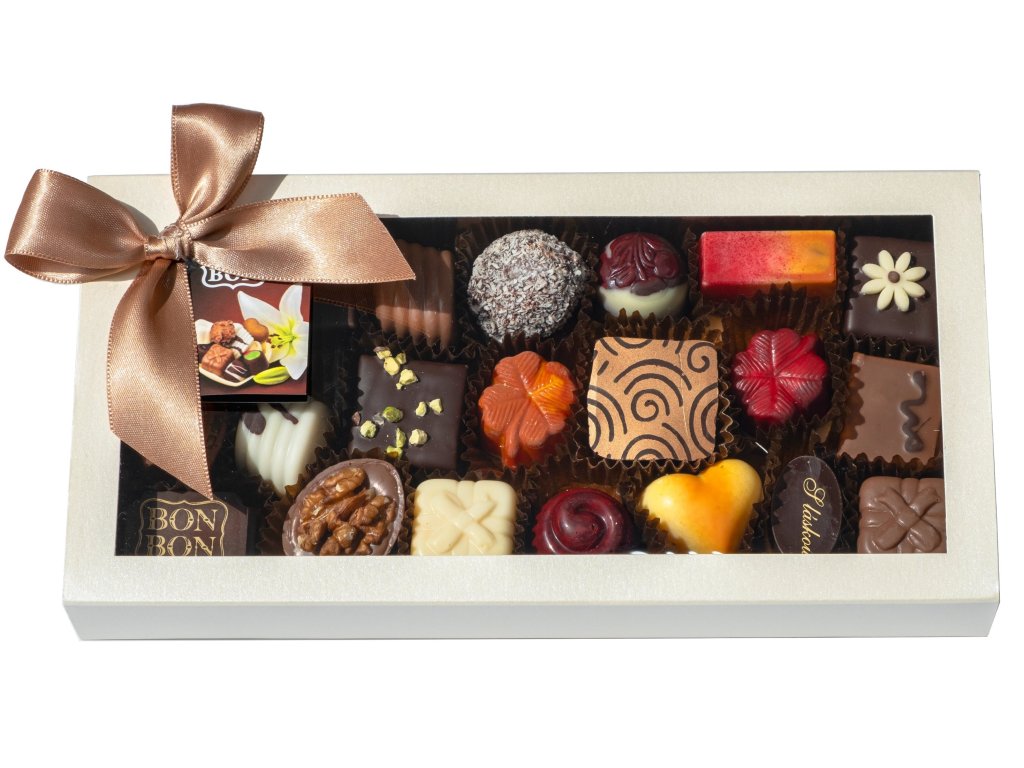 Jednotlivé druhy pralinek v setu se mohou lišit od fotografie, v závislosti na naší aktuální, čerstvé nabídce vyrobených druhů