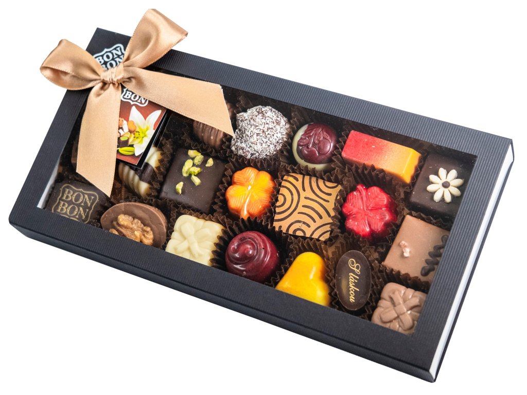Jednotlivé druhy pralinek v setu se mohou lišit od fotografie, v závislosti na naší aktuální, čerstvé nabídce vyrobených druhů