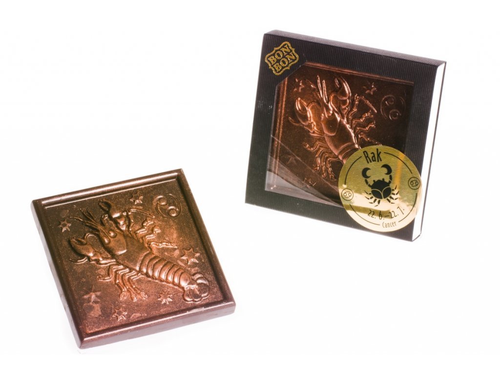 Znamení RAK – ručně odlité z kvalitní hořké čokolády (min. 58 % kakaa) nebo jemné mléčné čokolády (min. 34 % kakaa), ozdobené elegantní jedlou bronzovou dekorací, která zvýrazní každý detail tohoto krásného symbolu.